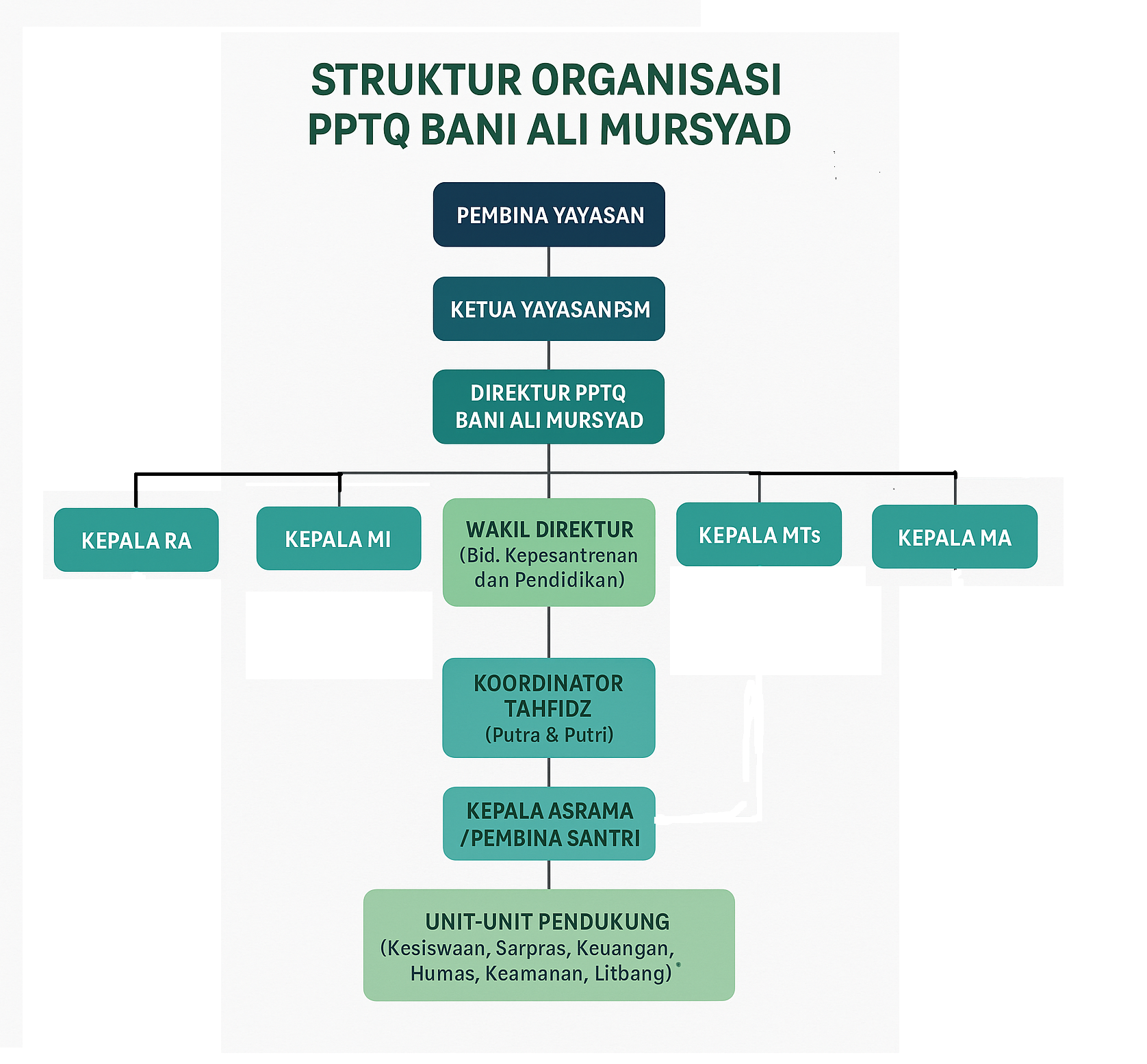 Kepala Lembaga Pendidikan (RA, MI, MTs, MA): Bertanggung jawab atas kurikulum, pengajaran, dan evaluasi masing-masing jenjang.